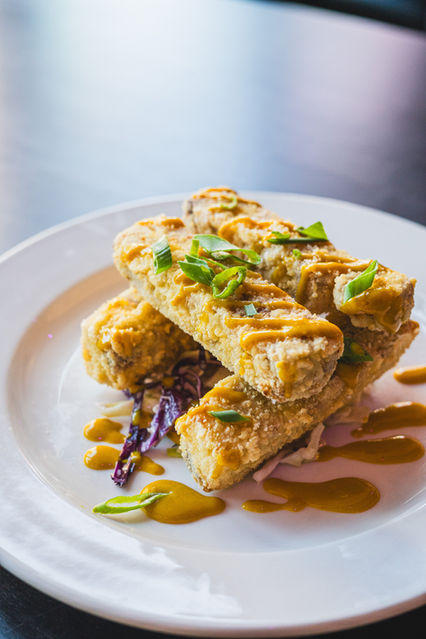 Deep fried lump crab cakes, Cajun remoulade, pickled red onions